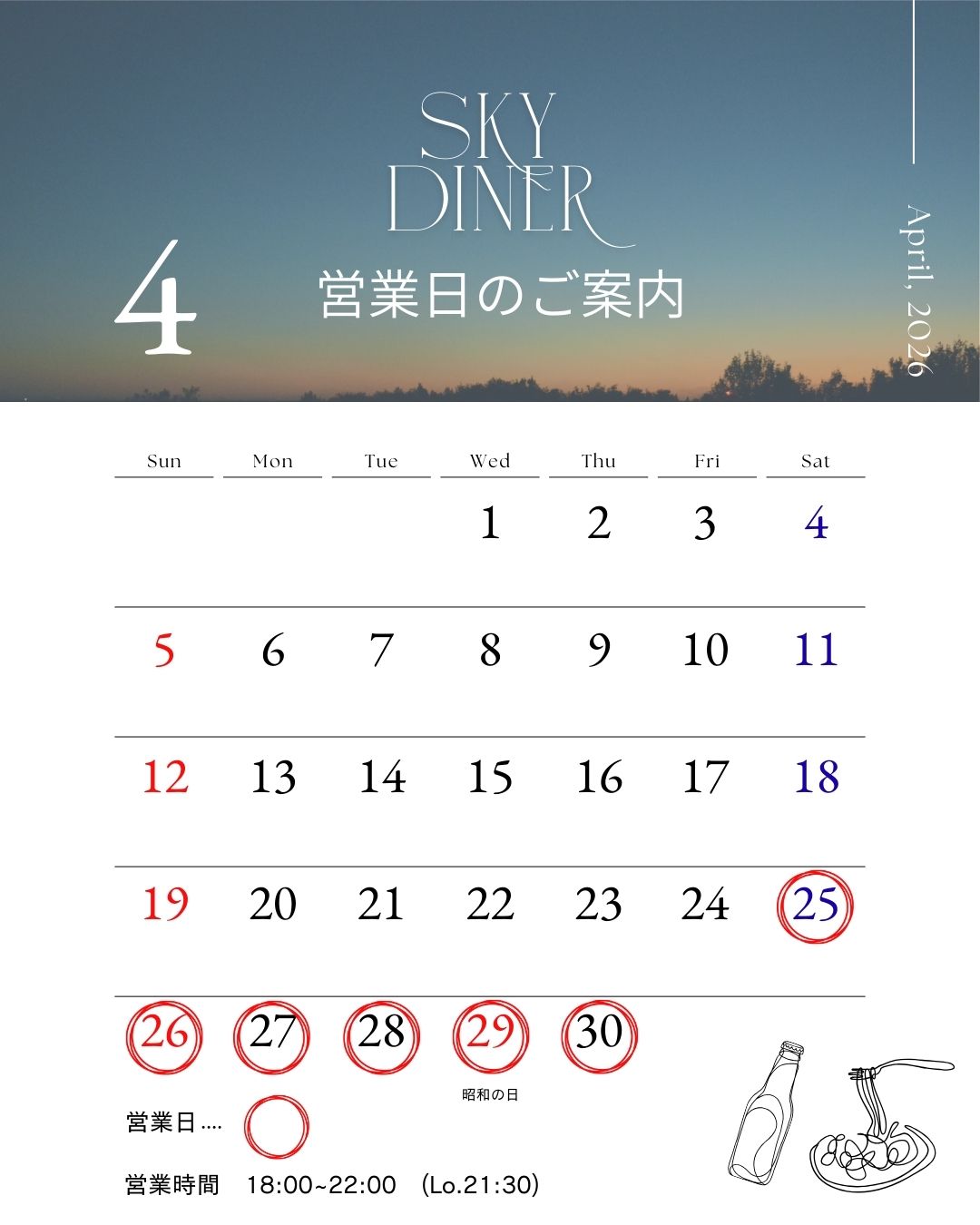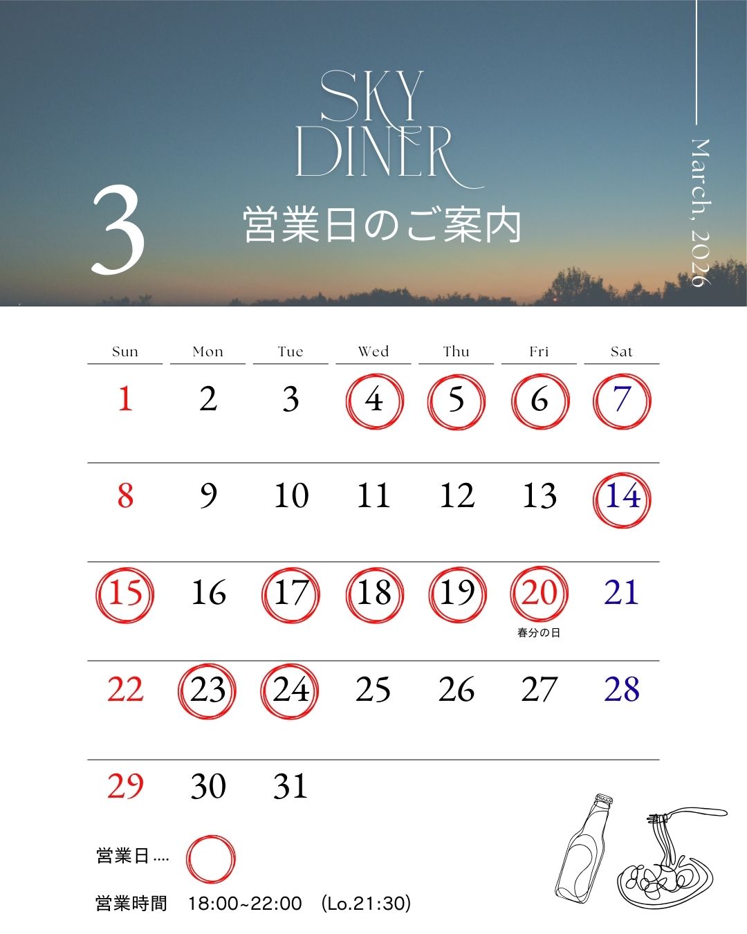 営業日:下記カレンダーを確認下さい営業時間 18:00~22:00 (Lo.21:30)