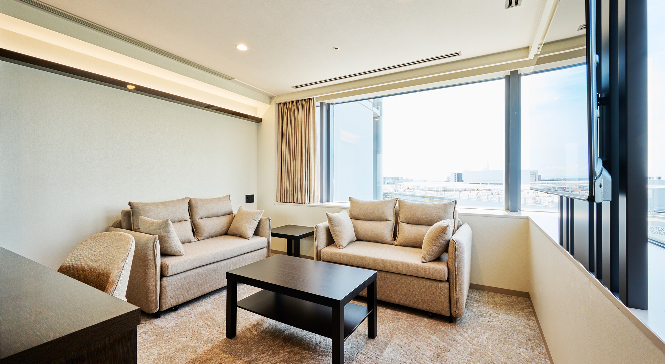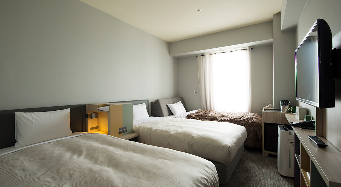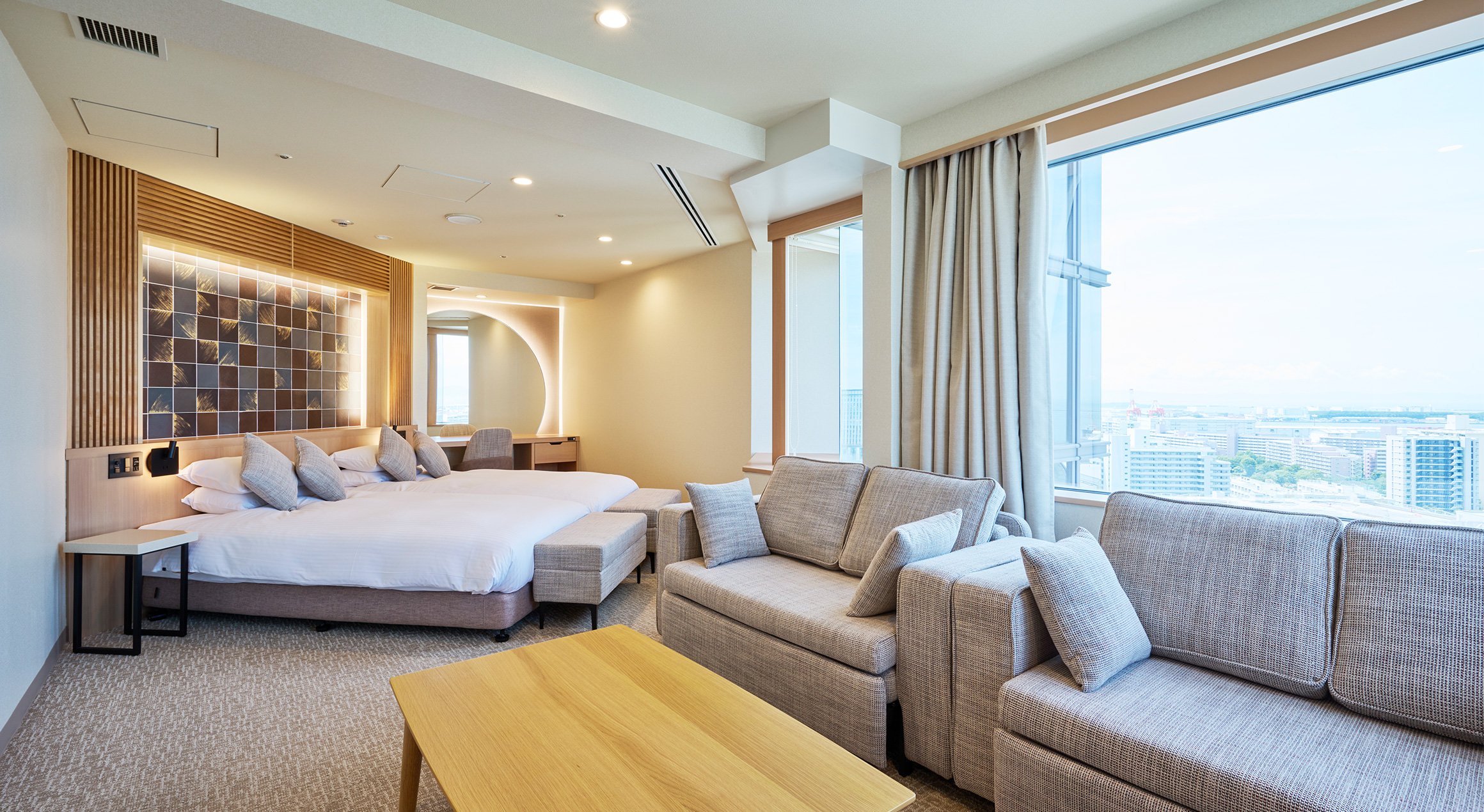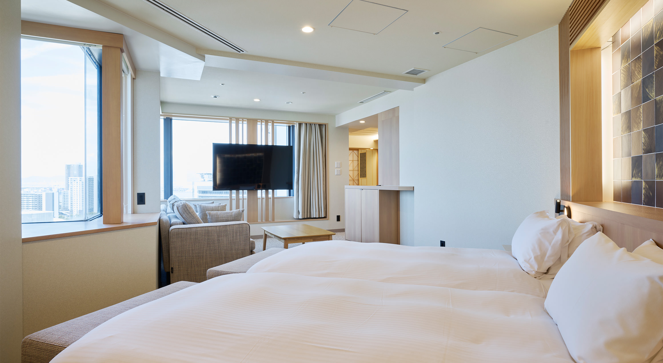 ゆとりあるリビングスペースを備えた「スーペリアツインルーム」。リビングのソファはベッドとしてもご利用いただけ、最大4名様まで宿泊可能で、ファミリーやご友人同士のご利用にもおすすめです。人気美容ブランド「ReFa」のアイテムを常設しております。