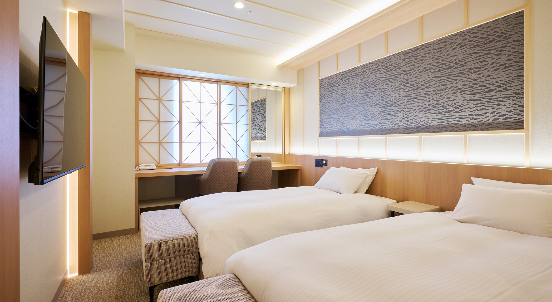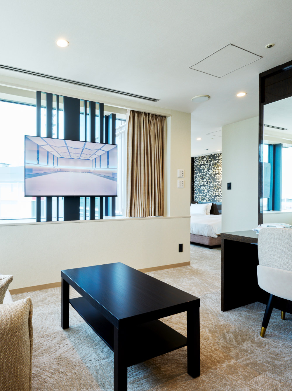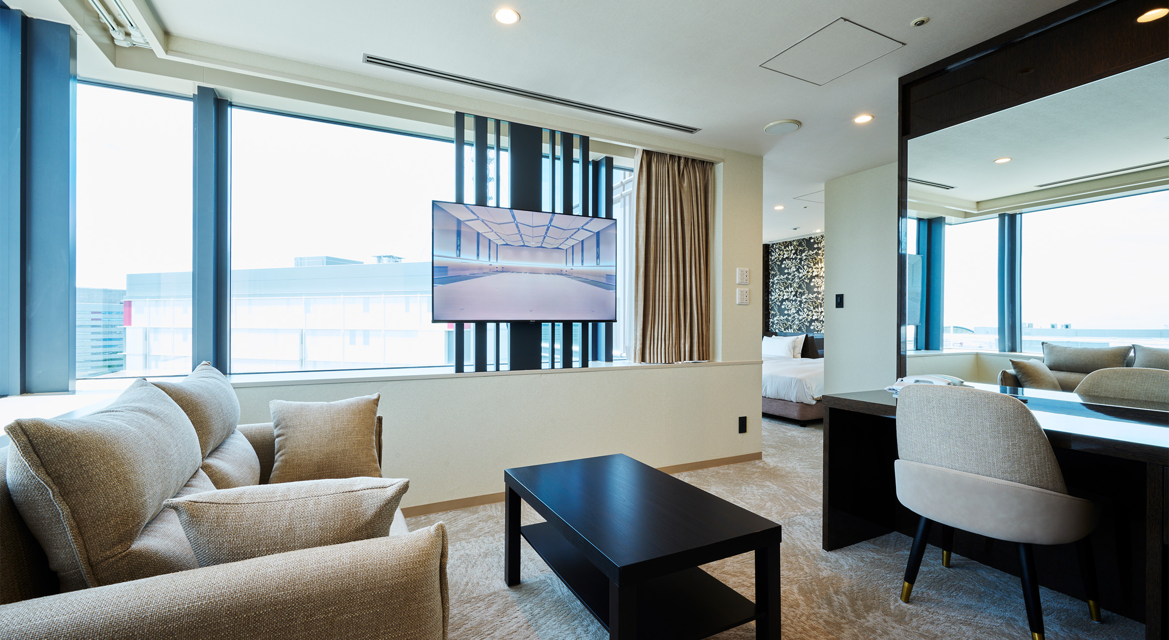 ゆとりあるリビングスペースを備えた「スーペリアツインルーム」。リビングのソファはベッドとしてもご利用いただけ、最大4名様まで宿泊可能で、ファミリーやご友人同士のご利用にもおすすめです。人気美容ブランド「ReFa」のアイテムを常設しております。
