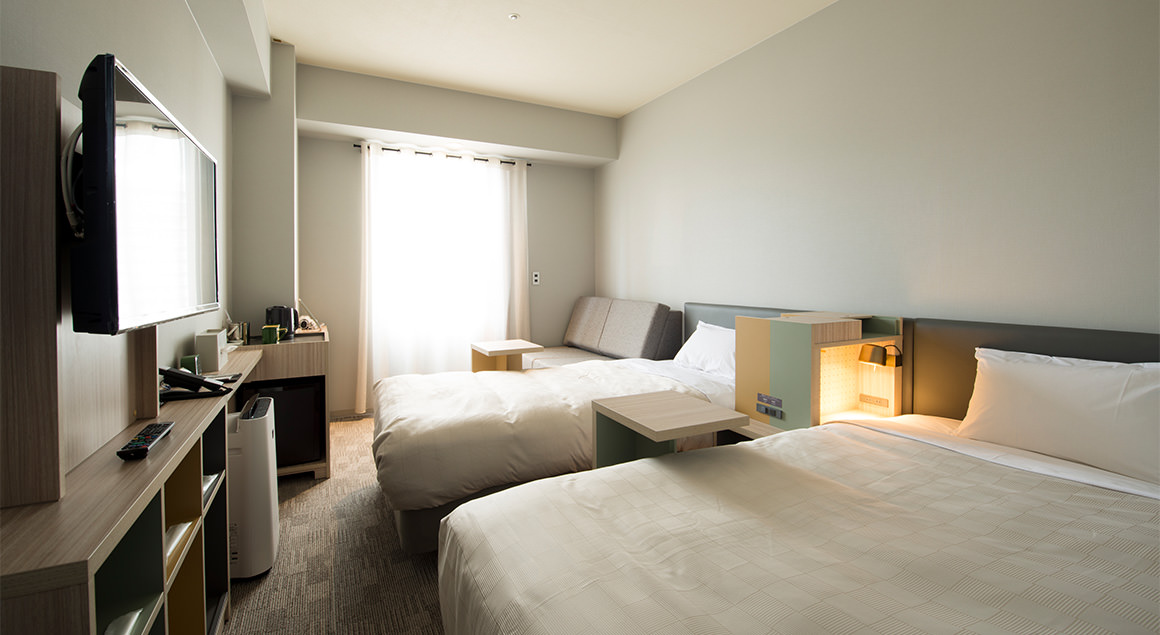 当ホテルで最も広々とした客室「デラックスフォースルーム」。リビングルームのソファはベッドとしてもご利用いただけ、最大6名様までご宿泊可能で、ご家族やグループ旅行にも最適なお部屋です。人気美容ブランド「ReFa」のアイテムを常設しております。